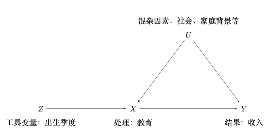 图2 工具变量的一个例子,箭头表示有因果关联