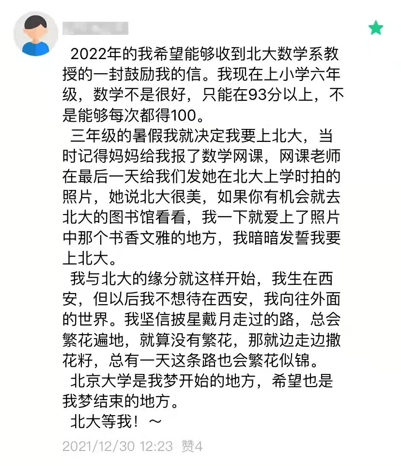 正在读小学六年级的马同学,向往着外面的世界。一次网课上,她看到了老师展示的北大风景图,憧憬着书香文雅的燕园,希冀能成为一名北大学子。然而,她的数学不是很好,不是每次都能拿到100分,她希望能收到一封北大数学教授鼓励自己的信。