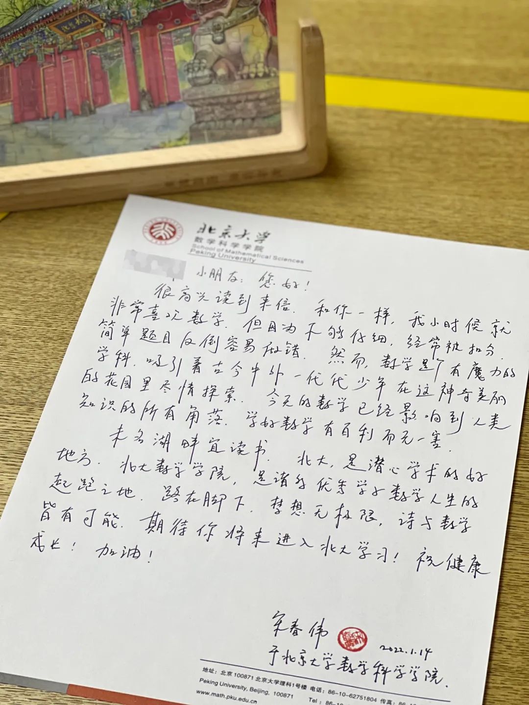 宋老师在信中写道,北大是潜心学术的好地方,北大数院是诸多学子数学人生起跑的首选之地,他期待着马同学能通过自己的努力,实现心中的梦想。