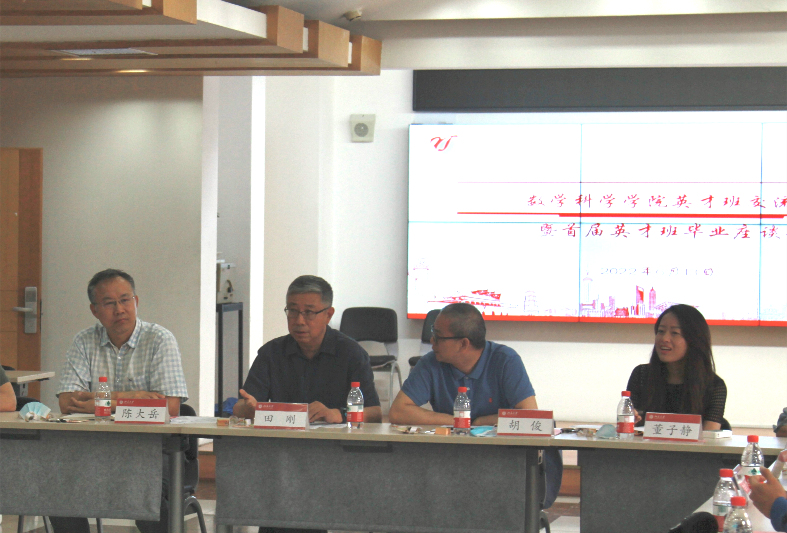 数学英才班交流会暨首届英才班毕业座谈会在理科一号楼1560举行,中国科学院院士、北京国际数学研究中心主任、2018级英才班第二班主任田刚,院长陈大岳,党委书记胡俊,副院长、党委副书记孙赵君,党委副书记董子静,北京国际数学研究中心办公室主任、2018级英才班第二班主任李东璘,数学英才班班主任、带班辅导员及各年级英才班学生代表参加。座谈交流会由学生工作办公室副主任牛贺主持。