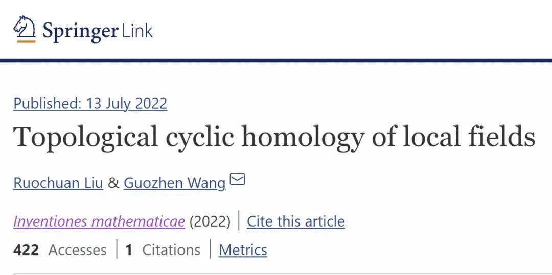 博雅特聘教授刘若川与上海数学中心教授王国祯合作的论文“Topological cyclic homology of local fields”。