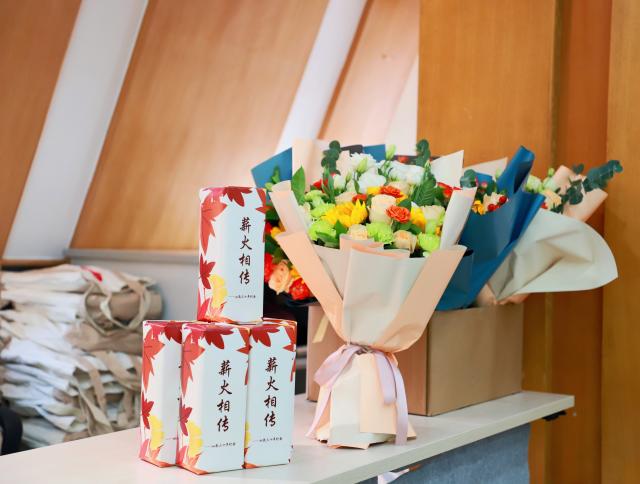 会上,新入职员工为从教三十年老师们献上了鲜花,从教三十年的教师向新入职员工送上写有他们希望寄语的贺卡,学院领导为从教三十年的教师赠送纪念品,共同品尝带有“薪火相传”字样的蛋糕,一起纪念这个重要的日子。