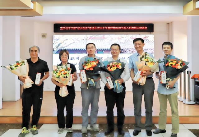 陈大岳、章志飞、孙赵君分别介绍了5位新入职教师、26位新入职博士后和9位新入职行政人员。李若介绍了本年度从教三十年教师张平文、周铁、杨家忠、刘旭峰、任艳霞、姜明、蒙在照等七位老师的成绩并对他们在教学和科研方面做出的诸多贡献表示感谢。周蜀林代表学院工会表达了对从教三十年教师的感激之情,同时也对新入职教职工表示热烈欢迎。他表示今年有40多位教职工入职,展现了数学院红红火火、欣欣向荣的发展趋势。