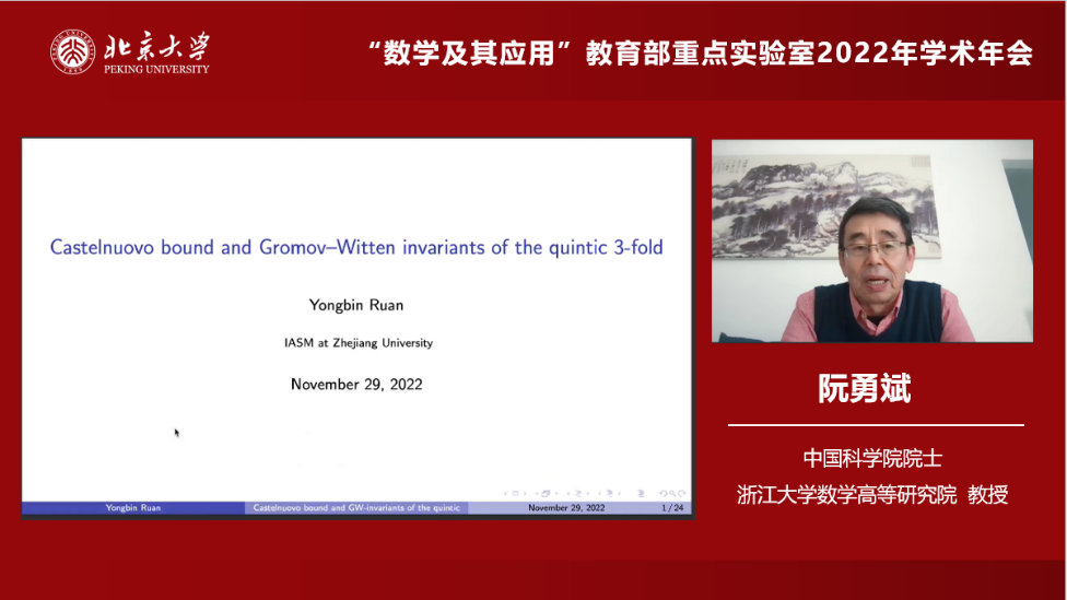 本届年会分为学术报告和学术委员会会议两个专场。在学术报告专场,浙江大学阮勇斌院士作了题为“Castelnuovo Bound and Higher Genus Gromov-Witten Invariants of Quintic 3-fold”的特邀报告;中科院数学与系统科学研究院张平院士作了题为“关于三维各向异性Navier-Stokes方程的整体解”的特邀报告。麻豆视频