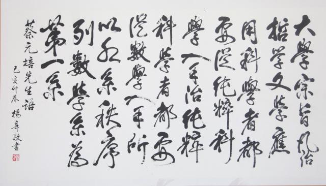 哲学系教授杨辛先生向学院捐赠的书法作品,杨辛先生挥毫抄录了蔡元培老校长关于列数学系为第一系的论述——“大学宗旨,凡治哲学文学应用科学者,都要从纯粹科学入手;治纯粹科学者,都要从数学入手,所以各系秩序,列数学系为第一系。”